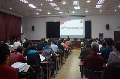 在四教七楼模拟法庭召开教工党员大会,学院教工党员参加会议,会议由党委书记徐庆国主持。