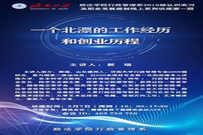 5月7日下午,行政管理专业2018级认识实习暨职业发展规划线上辅导系列讲座第一期如期进行。本期辅导讲座很高兴邀请到行政管理专业2009届郭瑞学长,讲座题目是《一个北漂的工作经历和创业历程》。学院正处级组织员国迎春、行管2018级全体同学、其他年级部分同学在线参加。讲座由宁有才老师主持。