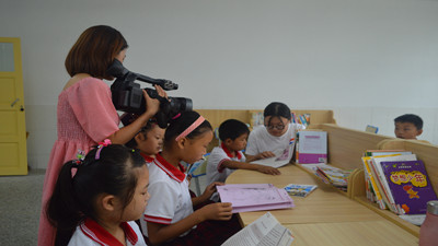 7月26日上午9时,嘉祥县委宣传部新闻科科长薛海波与嘉祥电视台记者胡素华一行到达万张街道中心小学对禁忌书屋