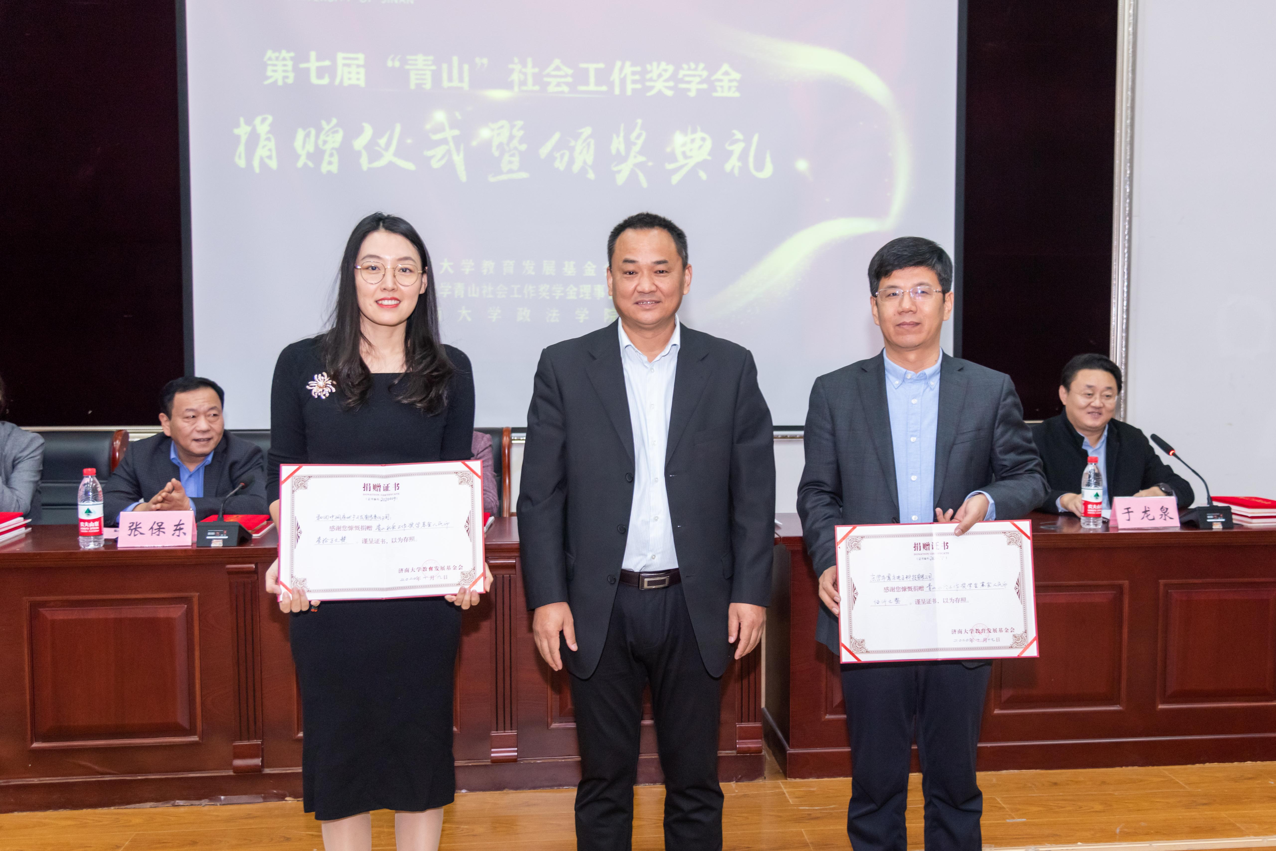 “青山”社会工作奖学金理事会副理事长、学校合作发展处副处长李仲涛为捐赠校友代表王玉华和牛保堂颁发了捐赠证书。