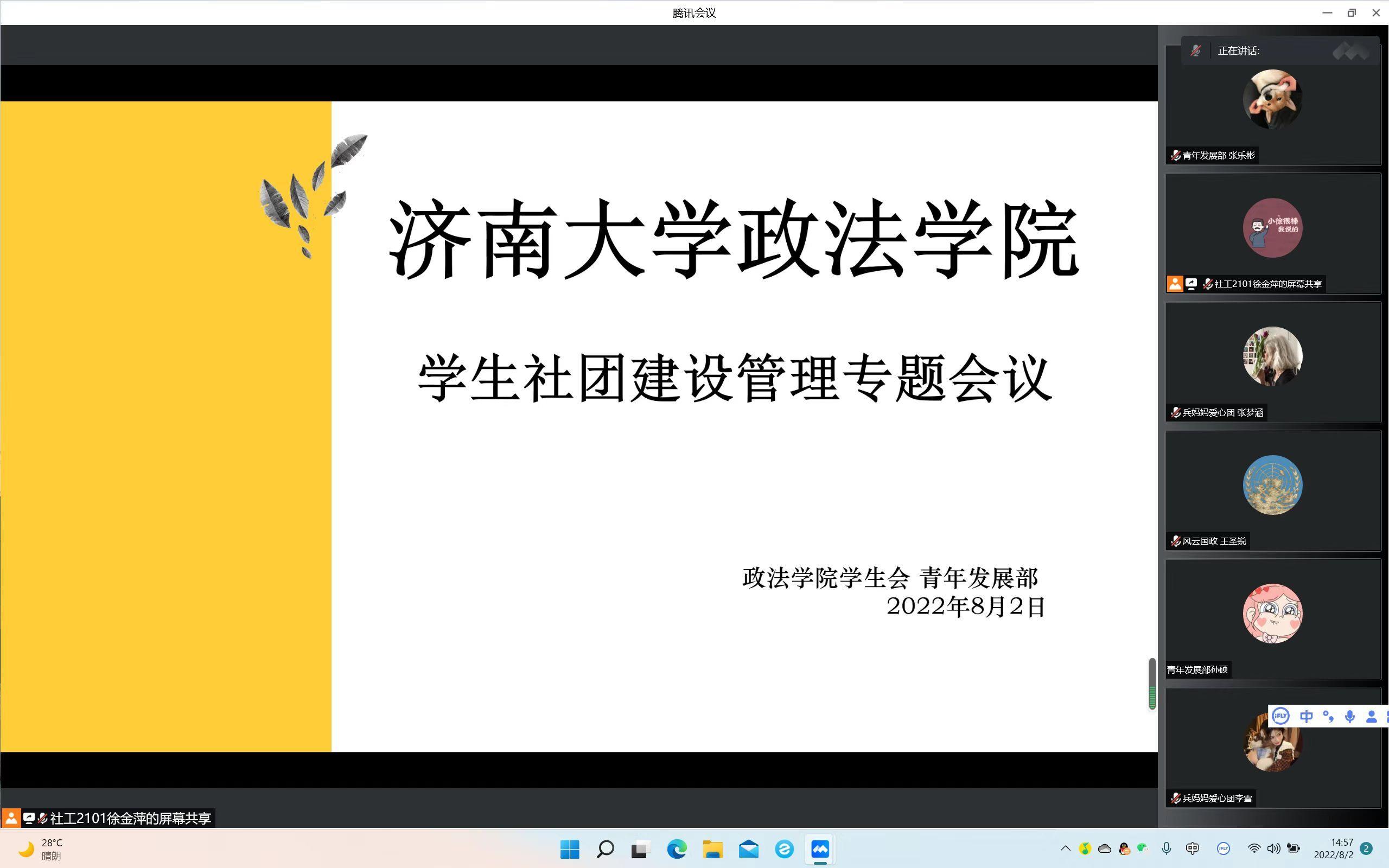 团委于8月2日线上召开学生社团建设管理专题会议。学院团委书记刘晓娟,学院指导社团的所有负责人,学生会青年发展部全体成员参加了会议。