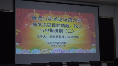 本学年度第六期青龙山学术论坛于四教模拟法庭举行。本次论坛的主题为:高层次项目的选题、论证与申报漫谈(三),邀请主讲嘉宾是王彩云教授和杨风教授。学院党委书记徐庆国、院长梁丽霞、副院长李慧明及全体任课教师出席本次论坛。