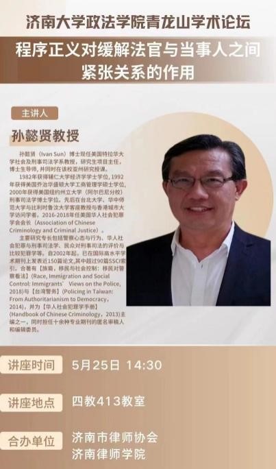 青龙山学术论坛在四教413举行。此次论坛邀请美国特拉华大学社会及刑事司法学系孙懿贤教授,作题为《程序正义对缓解法官与当事人之间紧张关系的作用》的报告。此次报告由禁忌书屋