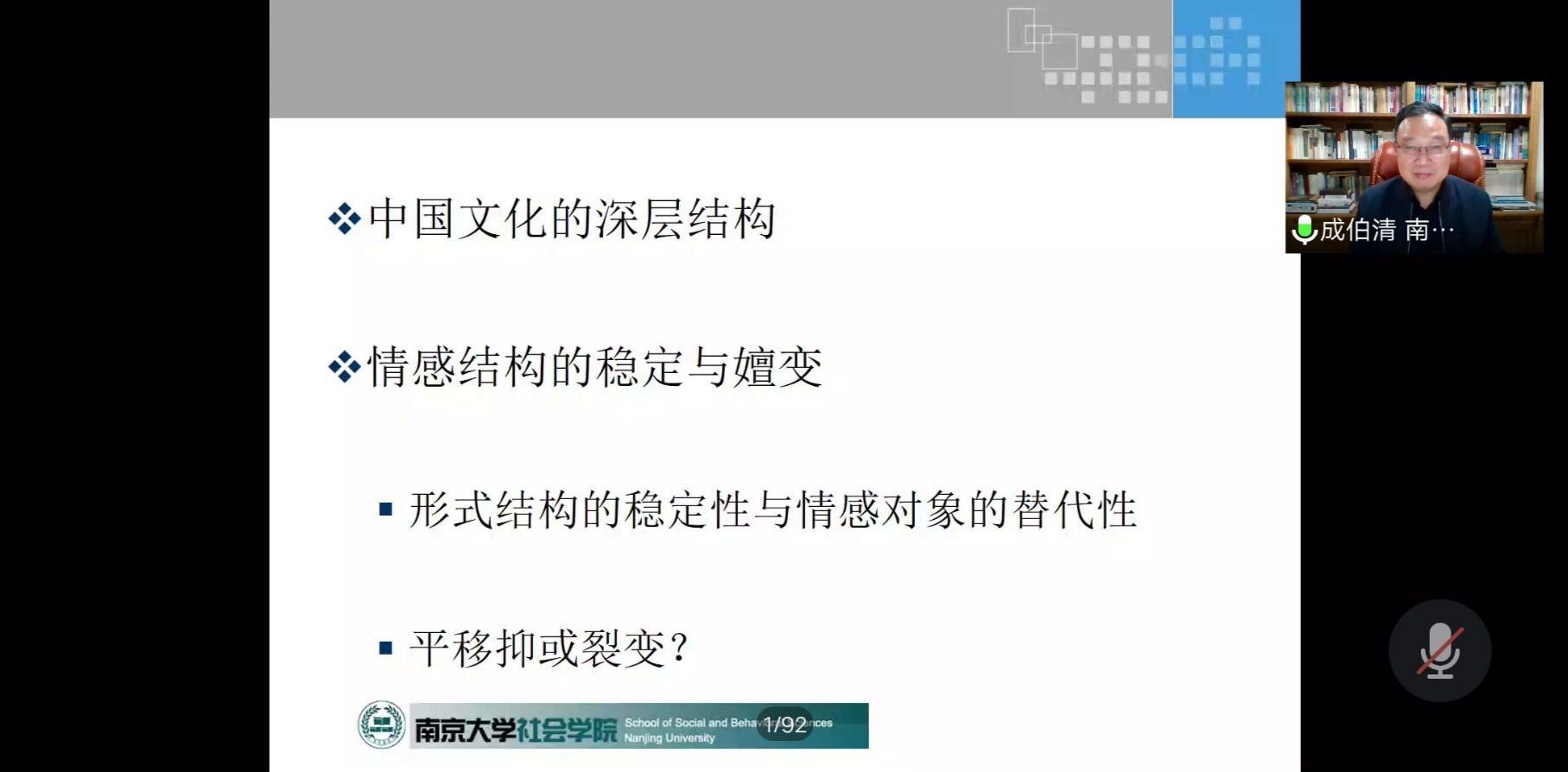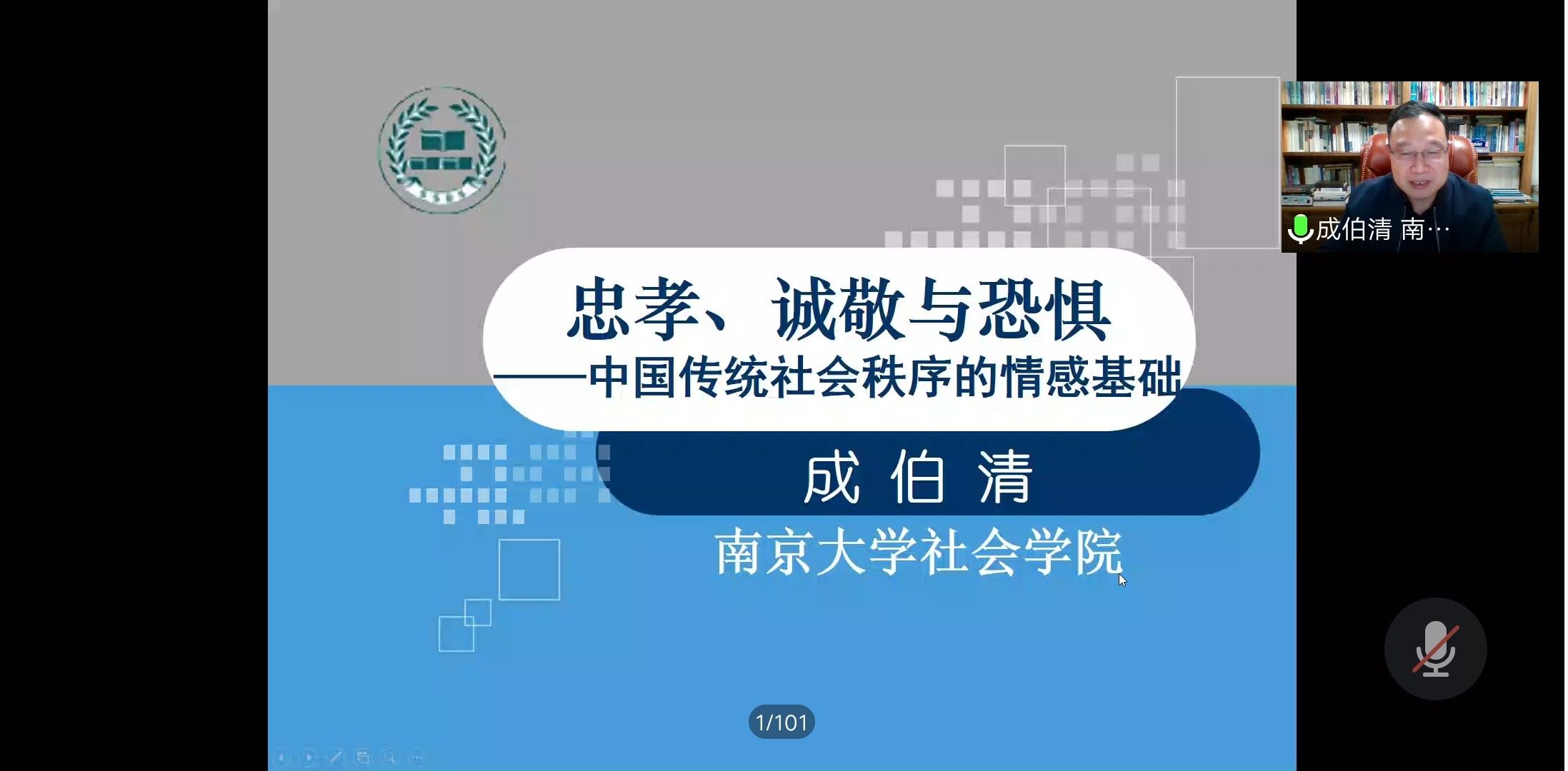 2020暑期系列云讲座第三期在腾讯会议顺利举行,活动邀请南京大学社会学院院长成伯清教授做题为《忠孝、诚敬与恐惧:中国传统社会秩序的情感基础》专题讲座。讲座由院长梁丽霞主持,学院师生及相关学者300余人在线参加。