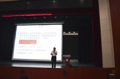 安全管理处处长丁立波为新生进行应急安全教育、防空安全教育及消防安全教育。