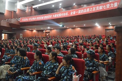 消防演练结束后,安全教育讲座正式开始。新生在教官的指导下有序地进入学校大礼堂就座。丁立波处长围绕着“不忘初心 牢记使命 攻坚突破 狠抓落实 为建设国内知名、全省一流的品质之区贡献七贤力量”展开,针对禁忌书屋