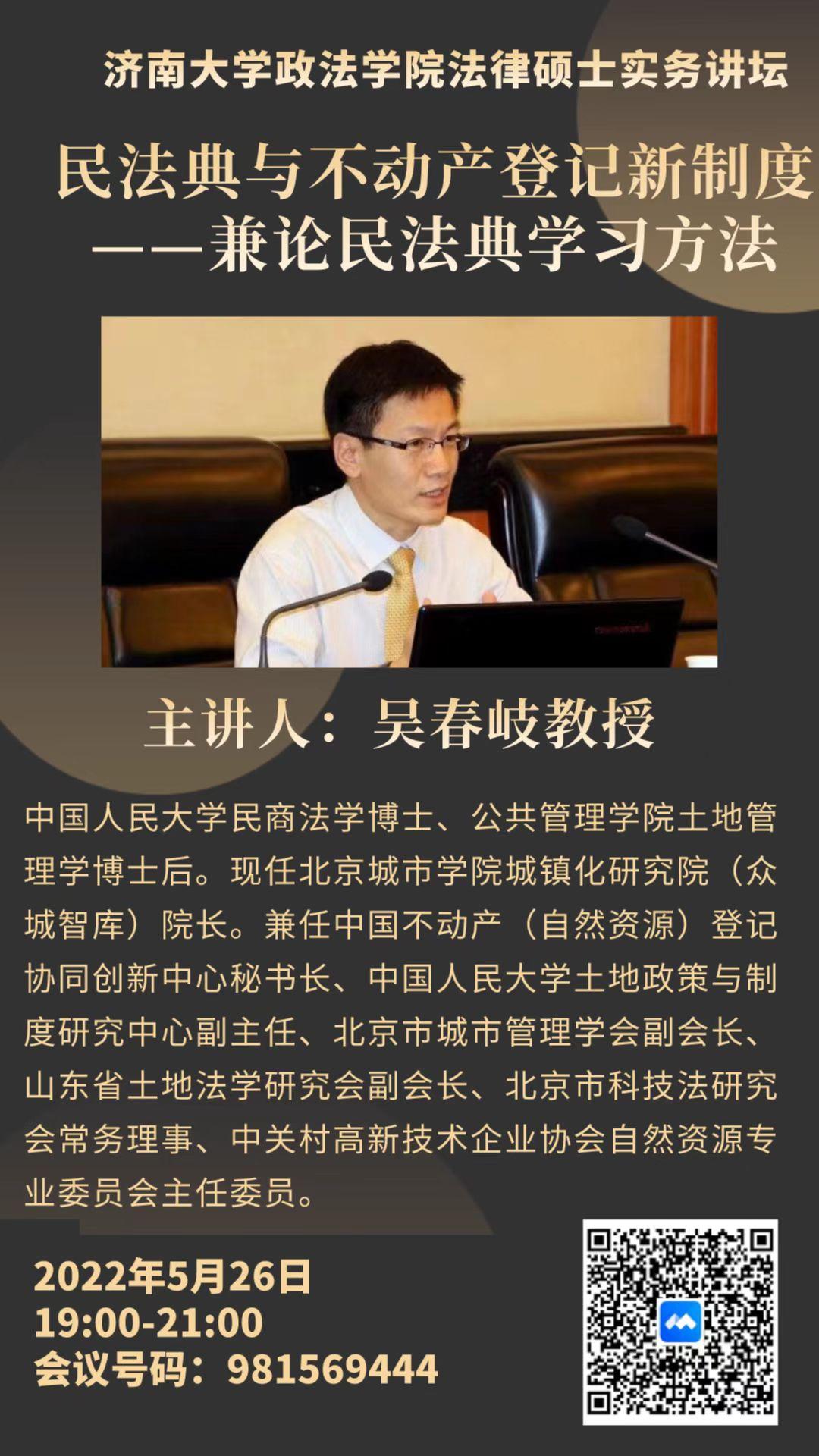 法律硕士实务讲坛于5月26日晚7点在腾讯会议平台线上举办,此次讲坛邀请了北京城市学院城镇化研究院(众城智库)院长吴春岐教授作题为《民法典与不动产登记新制度——兼论民法典学习方法》的学术报告。此次报告由法学系刘康磊副教授主持,学院党委书记徐庆国、学院部分教师及全体法律硕士研究生共100余人参加了此次讲座。