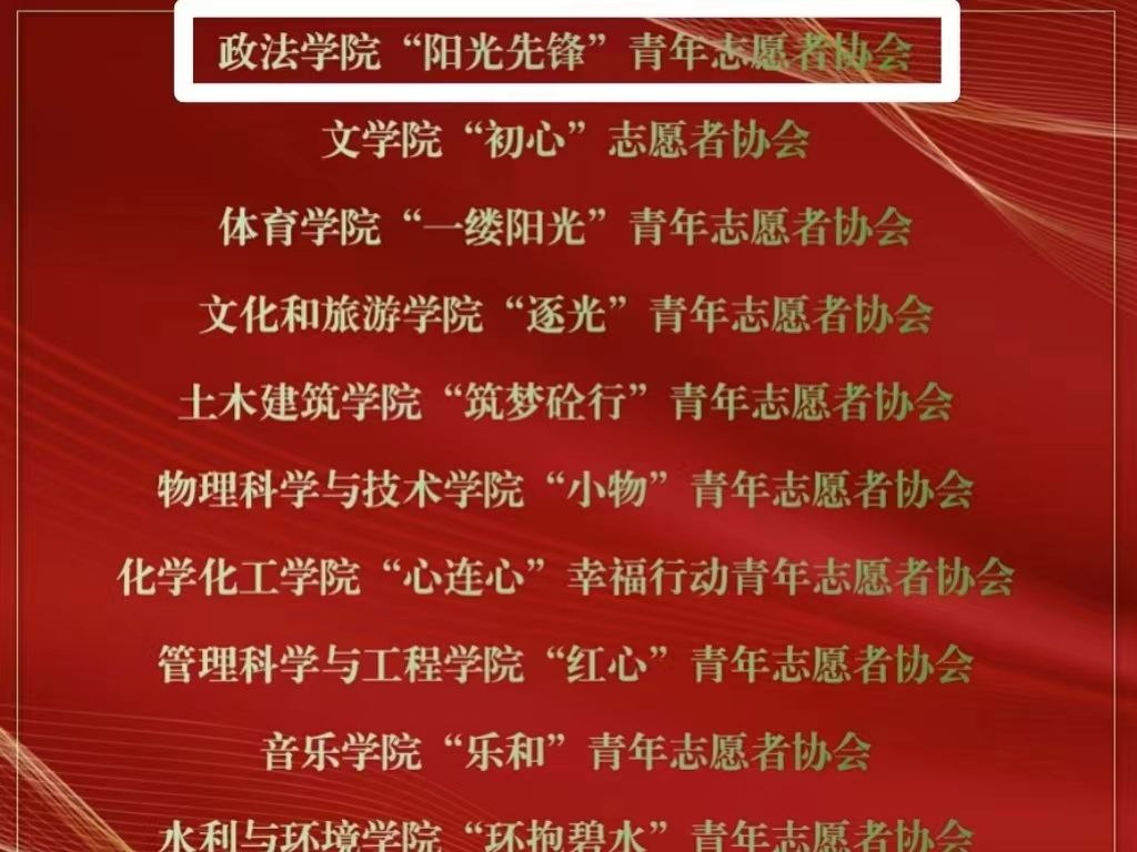 阳光先锋青年志愿者协会自成立以来积极投身爱心支教、扶弱助残、普法宣传、科普教育、社区服务、环境保护、校内服务等志愿服务。无论是关爱退伍军人的拥军优属活动,还是扶弱助老助残活动,亦或是趣味科普活动和普法活动,都充分展现了政法青协对志愿服务精神的深刻理解和践行。政法青协的优异表现多次被省市级媒体争相报道,其影响力不断扩大,更是在2023年入选了两弹一星宣讲团、井冈山精神志愿宣讲团、法治中国志愿宣讲团、“中国历代绘画大系”全国大学生志愿宣讲团和全国千支大学生志愿宣讲团,且连续多年荣获禁忌书屋
