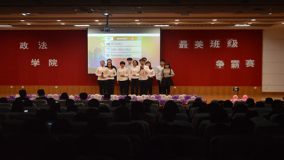 在最美班级的舞台上,参赛者们为我们带来了欢声笑语。来自政治1706班的《情歌王多人串烧》节目将一片欢庆融洽的气氛带入了现场,让同学们感受到了浓郁的欢乐气氛。政治1703班带来的小品《你还爱我吗》凭借着参赛者们诙谐的台词和精彩的表演引发了一阵阵笑声,将此次活动推向高潮。而社会1702班的《响应十九大,最美爱国情》的朗诵节目,鼓舞着我们每一个学生站在新时代的起跑线上去践行十九大的美好蓝图,去落实十九大的核心价值观,将我们的心与国家紧紧相连。法学1703班翻拍的小品《同学会》更是为观众带来了欢乐,掌声和欢呼声此起彼伏,台上台下一片激情四溢的海洋。三个多小时的争霸赛在《致橡树》的朗诵中画上了句号。经评委打分,法学1703班荣获此次活动三等奖,政治1703班荣获此次活动二等奖,社会1702班荣获一等奖。