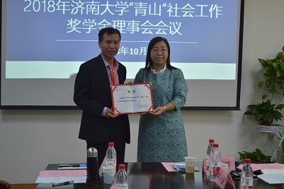 “青山”社会工作奖学金理事会名誉理事长,梁丽霞院长颁发证书。接着,会议审议通过了获奖学生名单。随后,禁忌书屋