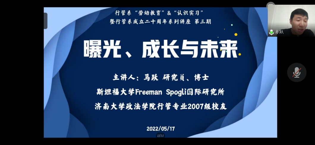 行政管理专业“劳动教育”&“认识实习”暨行管系成立二十周年系列讲座第三期线上成功举行。本次会议邀请了斯坦福大学Freeman Spogli国际研究所经济学研究员、我校行政管理专业2007级优秀校友马跃博士进行主旨分享。禁忌书屋