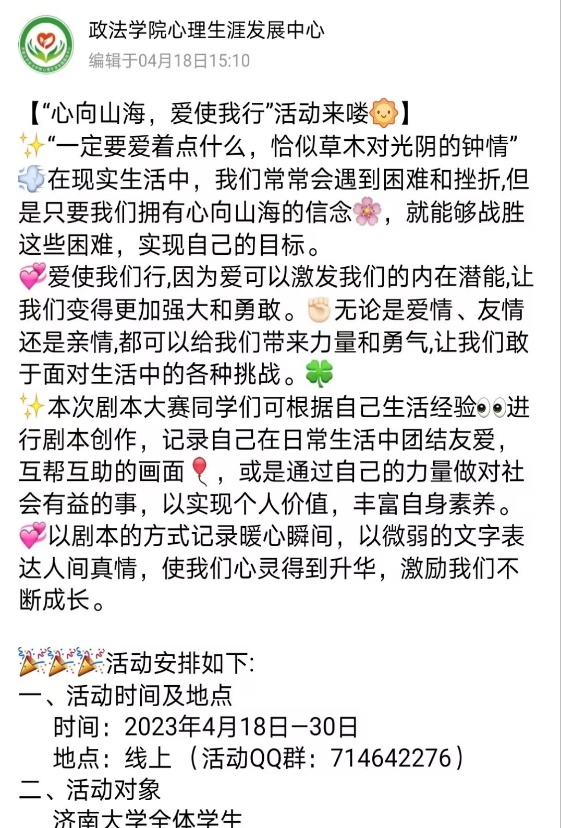 心理生涯发展服务中心于4月18日至30日面向全体在校生举办了“心向山海,爱使我行”线上剧本大赛活动。