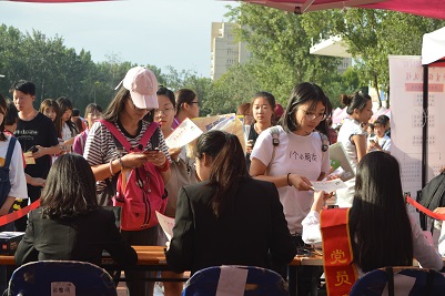 “同学,你好,入学报到请跟我来。”为迎新服务的同学们不停的穿梭在大操场上,将一个个新生带到学院新生入学咨询处。工作人员为新生登记信息并发放档案袋,老师及志愿者就禁忌书屋概况