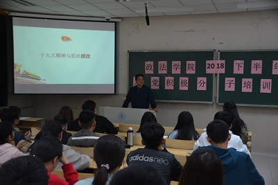副院长刘康磊给学员们讲解了十九大精神与宪法修改,使入党积极分子认识到推动宪法与时俱进是我国宪法发展的必由之路,同时也进一步加深了入党积极分子对十九大精神的学习和认识。培训期间,入党积极分子还接受了更为直观的影视教育,观看了六集《辉煌中国》纪录片。影片充分展示了十八大以来中国经济社会发展取得的历史性成就,进一步增加了大家的安全感、自豪感、幸福感。