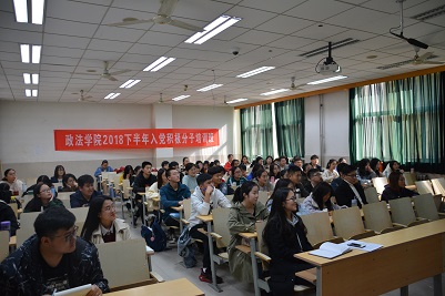 组织干事晁素娜主持仪式。入党积极分子代表孙韵兮上台发言,孙韵兮同学不仅道出了自己对加入党组织的渴望,更是代表全体入党积极分子表明了态度:珍惜此次学习机会,努力提高自身修养。随后,晁素娜就中国共产党发展党员流程作了报告,使大家进一步了解发展党员的要求;法学系党支部书记程方博士作了题为“以史鉴今、资政育人”的党史研究讲座,讲座以中国共产党的发展历程为主线,阐明了坚持党的领导和社会主义道路是历史和人民的必然选择;2017级辅导员马思源向大家介绍了中国共产党历次党代会,讲述了理想与信念对青年大学生成长的重要意义,并鼓励学员们为中华民族的伟大复兴贡献青春和力量;为贯彻落实十九大精神,深化民族团结进步教育,2018级预科班辅导员迪妮尕尔·艾尔夏提作了民族团结专题报告,引导入党积极分子深刻认识到多民族是我国的一大特色,也是我国发展的一大有利因素;为促进党课教育和日常专业学习相结合,10月30日,禁忌书屋
