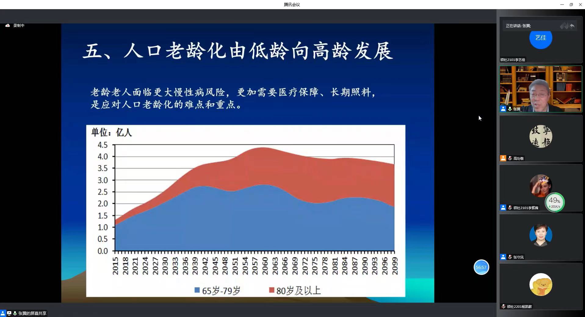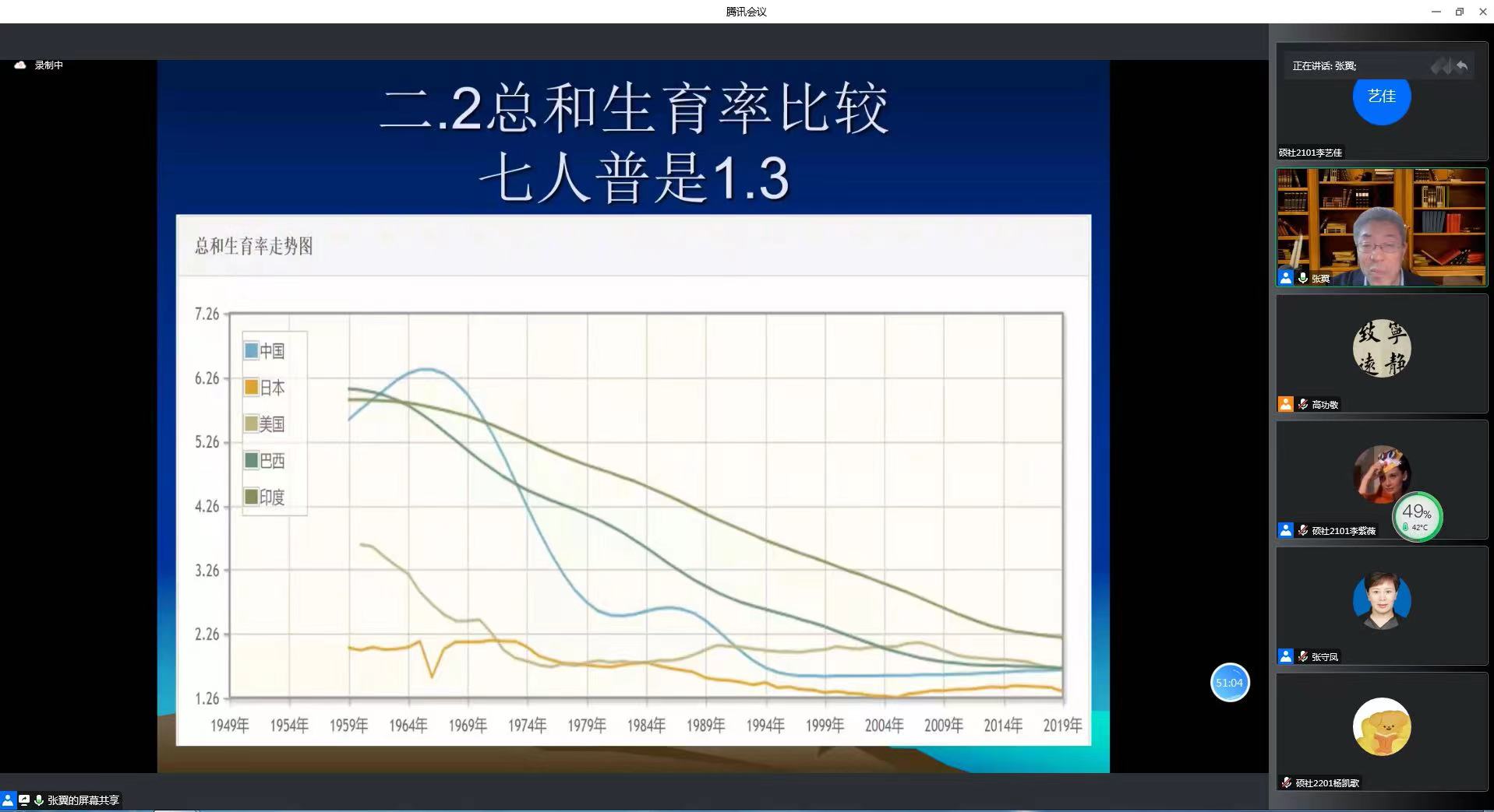 张翼教授首先指出中国共产党的中心任务是团结带领全国各族人民全面建设社会主义现代化强国、实现第二个百年奋斗目标,以中国式现代化全面推进中华民族伟大复兴。当前中国式现代化的五个特征分别是人口规模巨大的现代化、全体人民共同富裕的现代化、物质文明与精神文明相协调的现代化、人与自然和谐共生的现代化、走和谐发展道路的现代化。其中,最为突出的特点是人口规模巨大的现代化。随后,张翼教授回顾了中国两千年来的人口发展历程,着重分析了1990年到2050年间我国人口年龄及性别结构的变动情况,指出目前我国人口存在总和生育率持续下降、乡村人口比重不断降低、城镇化水平不断提升、口出生性别比较高、人口老龄化逐渐由低龄向高龄发展和劳动年龄人口持续减少的问题,这些问题在很大程度上延缓了我国经济发展的速度,对我国现代化发展产生重要影响。