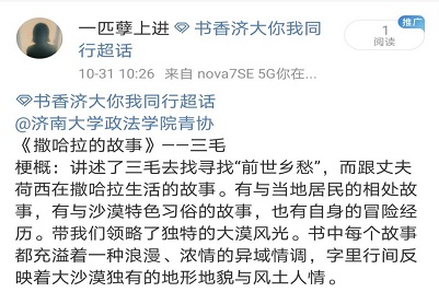 的同学们踊跃参加,在微博平台上积极发表自己的见解,互相交流,完美营造了良好的读书学习氛围,努力打造书香校园。