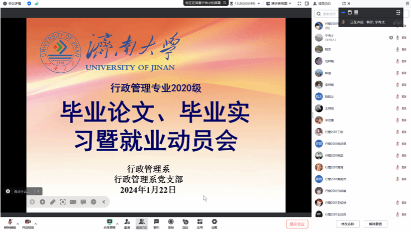 为进一步保障2024届毕业工作顺利开展,做好政策宣传和讲解,更好地提升本科生毕业论文、毕业实习和就业质量,1月22日下午,行政管理系与系党支部于线上举办2024届毕业生毕业论文、毕业实习暨就业动员大会。行政管理系部分老师、行政管理系全体毕业生参加会议,行政管理系主任宁有才主持会议。