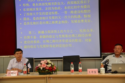 报告会以“一带一路”倡议提出的历史依据与前景发展为主题,王教授从历史上各个时期仔细的分析了丝绸之路的开通,认为张骞通使西域之前,丝绸之路早已开通,之后王教授耐心的讲解丝绸之路在东汉魏晋时期、唐宋时期、蒙元时期、明清时期以及民国时期发展的重要阶段,包括海上丝绸之路的发展。王教授认为,丝绸之路的发展前景美好,是西部地区发展的又一次大的机遇,有利于进一步激发丝绸之路的生机与活力,密切我国及沿线地区国家相互之间的友好往来,推动我国及沿线地区国家政治经济文化的发展。学术报告结束之后,王教授与在座师生就讲座相关问题展开了热烈交流与讨论。