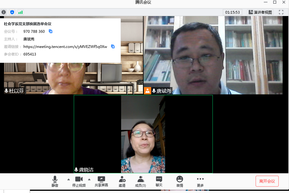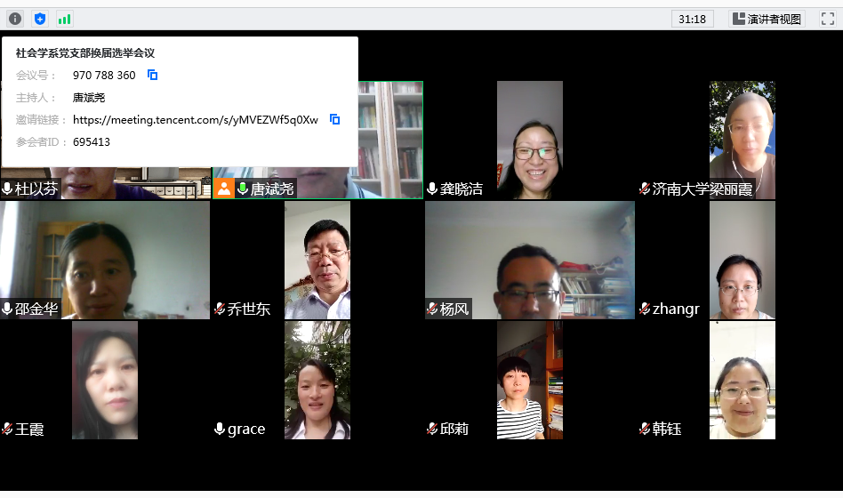 2020年6月12日下午,通过网络腾讯会议,社会学系党支部召开了一次别具生面的网上换届选举会议。该次会议由上一届党支部书记唐斌尧主持,社会学系党员教师参加,学院领导梁丽霞院长列席参加。