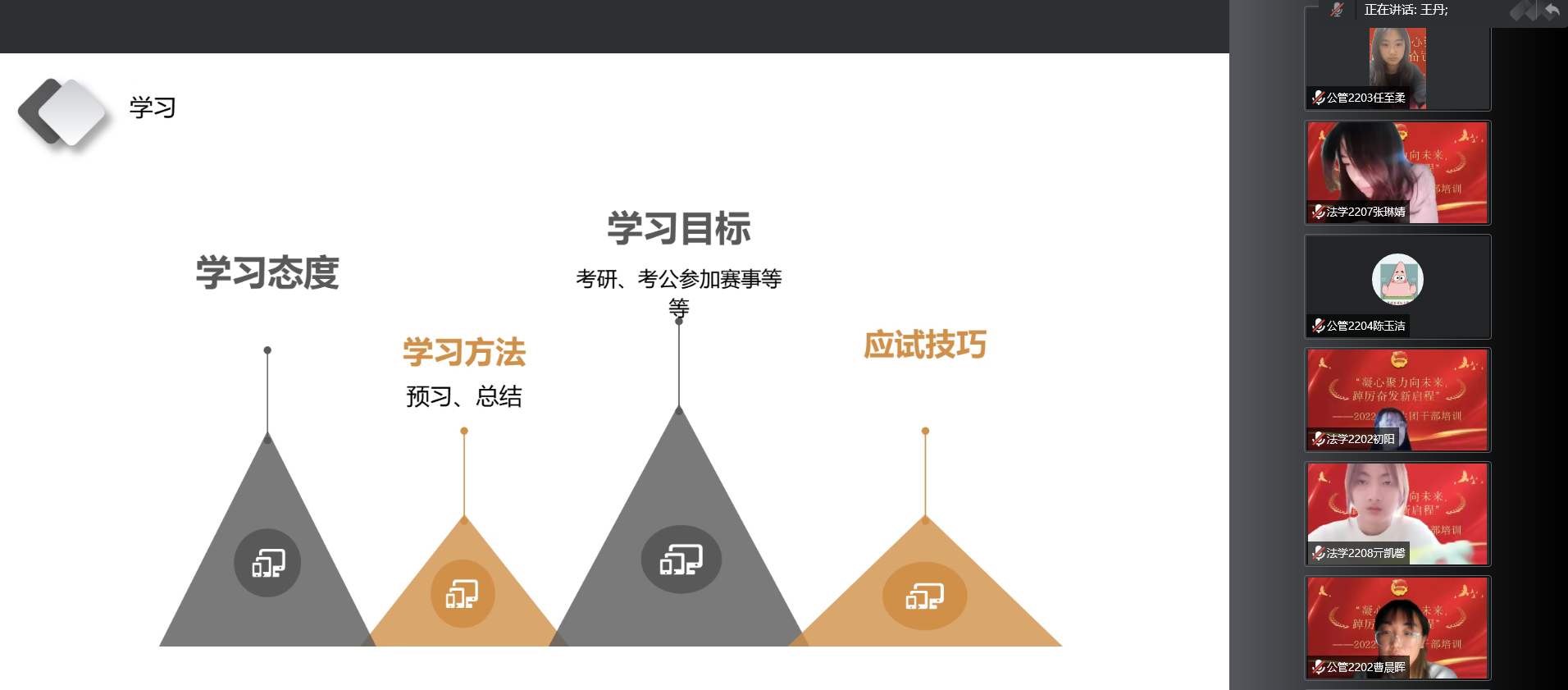 在优秀团干部分享阶段,2022届毕业生团干部代表王丹通过分享自身担任四年团支书的经验和心路历程,为团干部如何开展工作进行了耐心的指导。