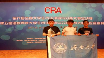 学生彭晓东、王一鸣、杨冠华的调研课题《投资与消费相结合的即时收益型理财模式探究——基于“互联网+”下的众筹概念》凭借严谨科学的统计方法、扎实灵活的表达能力从来自全国27个省、自治区、直辖市的117所高校、1020名师生中脱颖而出,荣获第六届全国大学生市场调查与分析总决赛一等奖。
