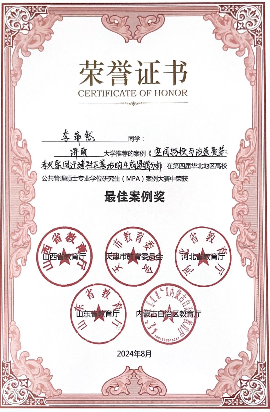 高度重视公共管理案例开发与案例教学工作,积极组织学生参与公共管理案例相关赛事,并于7月27日承办了第四届山东高校公共管理硕士专业学位研究生(MPA)案例大赛,我校团队荣获一等奖、三等奖各1项。本次华北地区大赛获奖是继山东省赛后取得的又一佳绩。