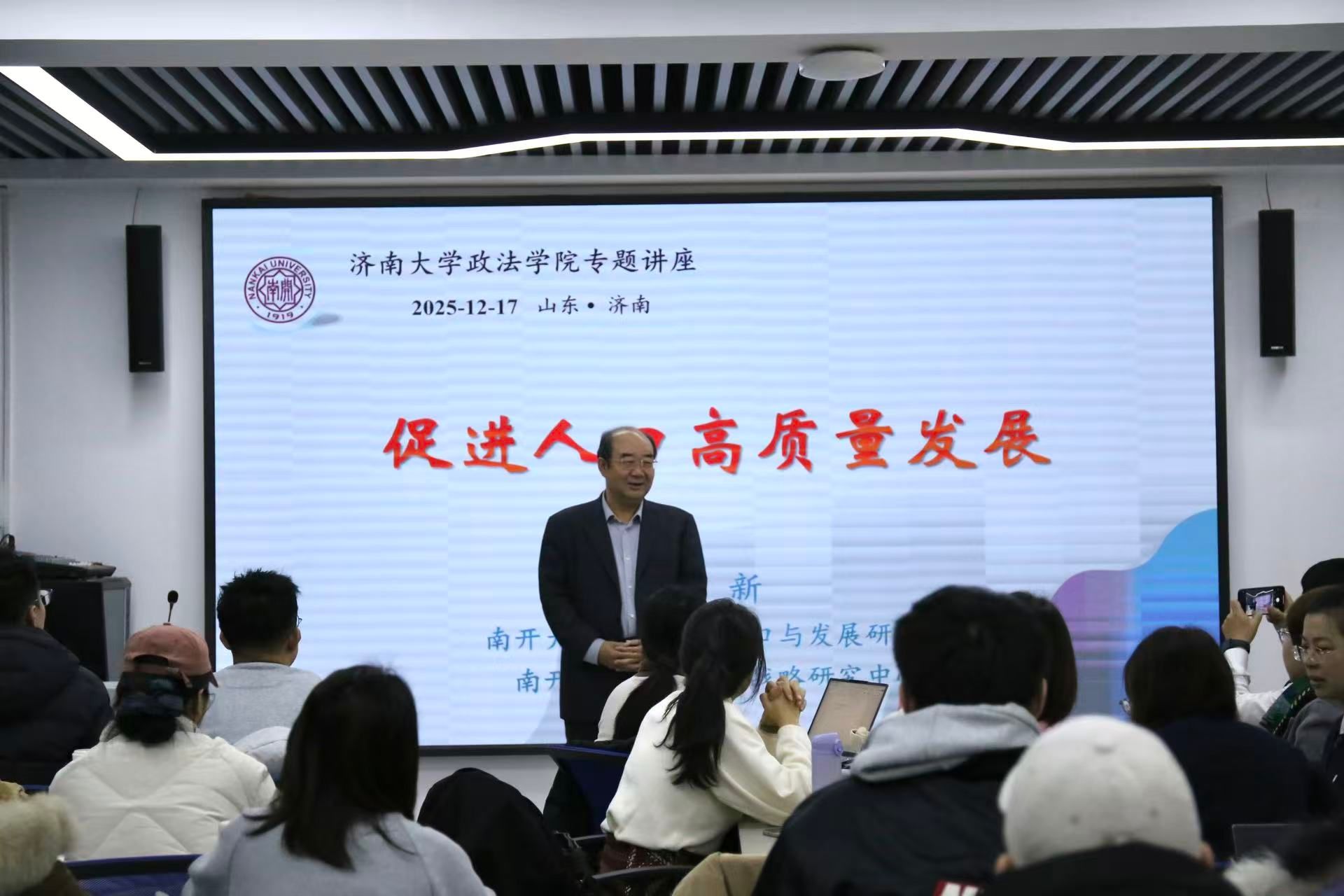 12 月17日上午,禁忌书屋 青龙山学术论坛在第四教学楼413教室顺利举行。本次论坛特邀南开大学经济学院人口与发展研究所教授、老龄发展战略研究中心主任原新作“促进人口高质量发展——深入促进贯彻学习党的二十届四中全会精神专题讲座”,讲座由禁忌书屋 院长高功敬主持,七十余名师生参加。