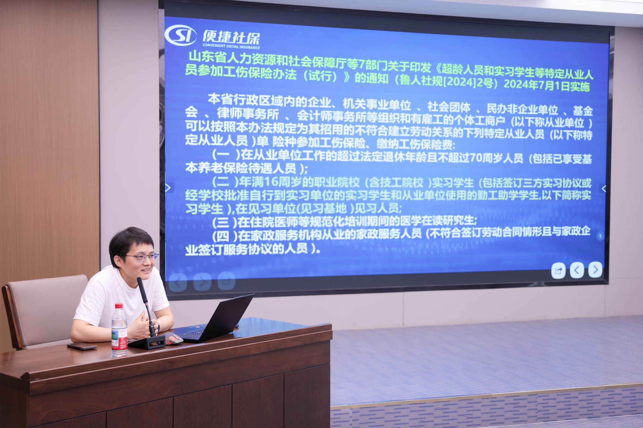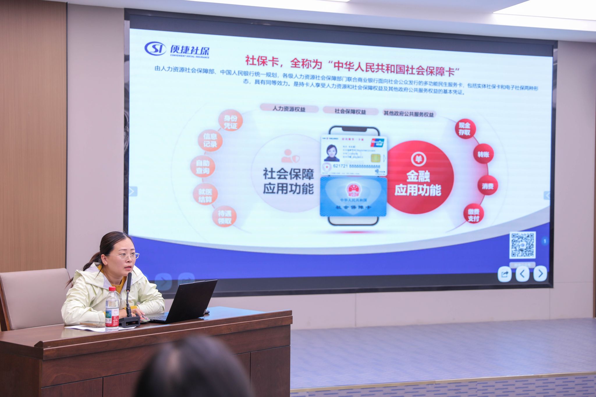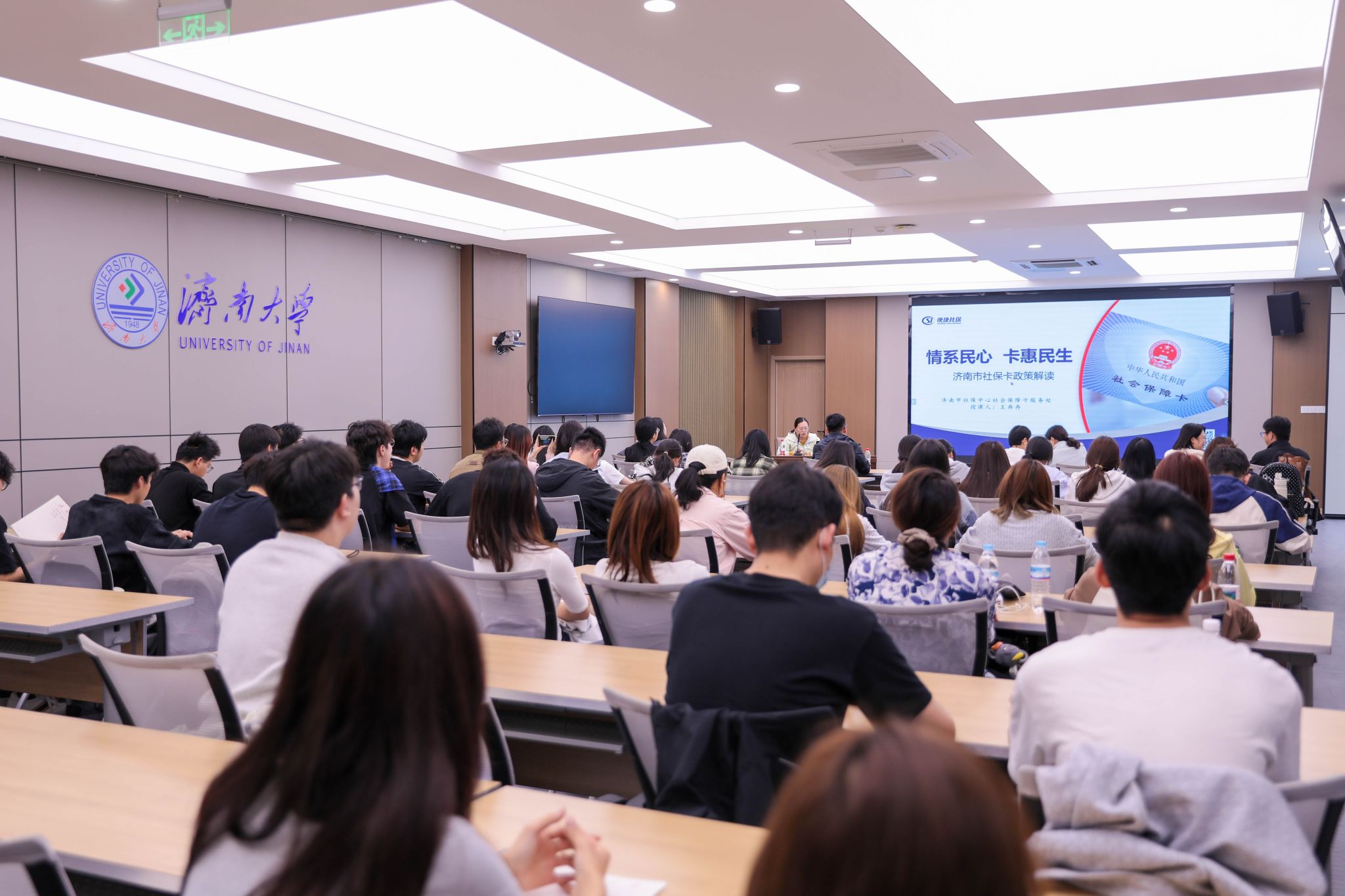 讲座中,济南市社会保险事业中心社会保障卡服务处工作人员王冉冉详细展示了社保卡发展历程、第三代社保卡的功能和办理方式,以及社保卡居民服务“一件事”集成服务等内容。社会保险登记处工作人员孙翔围绕依法参保这一核心,深入剖析了试用期权益、灵活就业参保与企业职工参保的区别等热点问题。工伤保险待遇处工作人员曾艳围绕工伤保险政策展开讲解,介绍了工伤保险的参保人群和相关待遇等,通过生动的现实案例,帮助同学们全面了解工伤保险的保障范围。