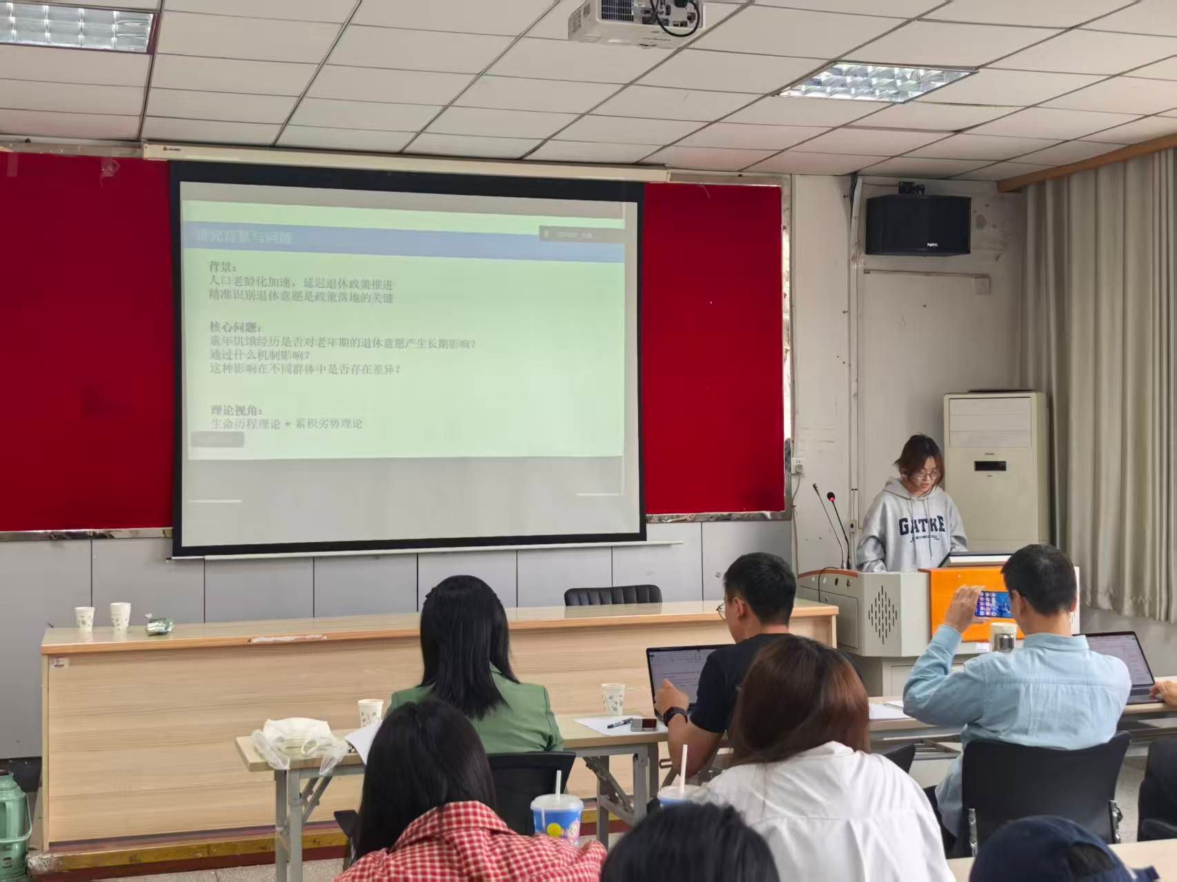 付巾帼、刘贺、陈静、匡铃娜、王杰五位同学分别就题为《童年饥饿经历对老年人延迟退休意愿的影响——基于CHARLS2014与2020年数据的实证分析》《媒体类型、叙事立场与青少年人工智能政策信念:趋利还是避害?》《省级政府政策注意力如何赋能企业数字化转型——基于2002-2022年数字技术词频的省级实证分析》《心理资本对居民多维相对贫困的影响-基于2022年CFPS数据的实证研究》《社会资本理论视角下动员老党员参与志愿服务的机制研究——基于R市老党员助农项目案例分析》的论文进行了PPT汇报。五位评委老师针对论文的选题、数据、理论、内容等关键方面进行了点评并提供了宝贵的指导意见。