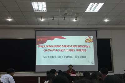 庆祝建党97周年系列活动之专题党课于2018年6月25日上午10:00在四教七楼模拟法庭举行,学院邀请了山东大学哲学与社会发展学院何中华教授做题为《关于共产主义的几个问题》的报告。法学系党支部成员全程倾听了何教授的精彩讲演。