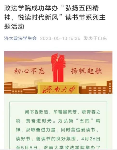 聚焦推进黄河流域生态保护和高质量发展重大国家战略,组织学生赴济南长清、东营垦利等黄河滩区迁建社区开展学生科创调研活动。组织青马班和研习社成员到山东舜翔律师事务所开展研学活动。开展“青衿之志,履践致远”“信望爱”、为军属子女进行课程辅导及兴趣拓展等志愿服务活动,引导青年学生用脚步丈量祖国大地,用眼睛发现中国精神,用耳朵倾听人民呼声,用内心感应时代脉搏,把对祖国血浓于水、与人民同呼吸共命运的情感贯穿学业全过程、融汇在事业追求中。学院1件作品获评第十八届“挑战杯”·山东省大学生课外学术科技作品竞赛一等奖,学院阳光先锋青年志愿者协会志愿宣讲团成功入选“2023年全国千支大学生志愿宣讲团”“2023年全国大学生井冈山精神志愿宣讲团”。