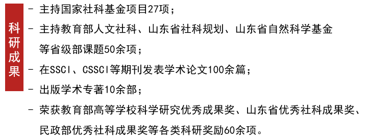近年来教师承担国家社科基金40余项(重点项目3项),省部级项目100余项,到账纵向、横向科研经费2000余万元;发表高水平论文300余篇,出版学术著作20余部;科研成果获教育部高等学校科学研究优秀成果奖1项,山东省社科优秀成果奖一等奖6项、二等奖10余项,其他省部级奖励20余项。承担省级和校级一流本科课程、精品课程、课程思政示范课程等20余门,出版教材20余部,获省级优秀教学研究成果奖6项。在校学生获国家级奖励20余项,省部级等奖项百余项。