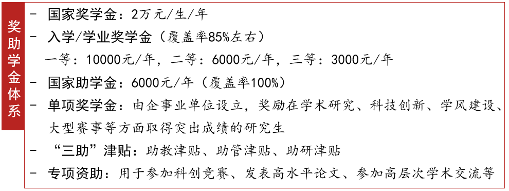 奖助学金制度健全,设立国家奖学金、入学/学业奖学金、国家助学金、单项奖学金、“三助”津贴等。学院专门出台《研究生教育质量提升计划与实施办法》,对研究生参与科创竞赛、发表高水平论文、参加高层次学术交流等给予大力资助与支持。