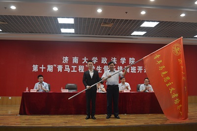 青马班从2008年开班到现在多次获得国家,省级,校级优秀团支部等荣誉。总结并肯定了近年青马班培训内容更加丰富、规模不断扩大、形式更加灵活的优秀成果。随后,学院党委书记徐庆国向第十期青马班班长牟柏霖授予班旗。