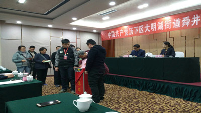 2018年1月5日,上午9时许,中国共产党历下区大明湖街道舜井社区党员大会在庄重雄浑的国歌伴奏声中正式开始了,本次大会以舜井社区党委成员换届为主题,大明湖街道办事处张保国书记、梁晶主持、舜井社区全体委员及居民参与,济大社工系实习生杨欣欣、李素琴及基爱舜井社区项目社工冯莹莹协助选举工作。