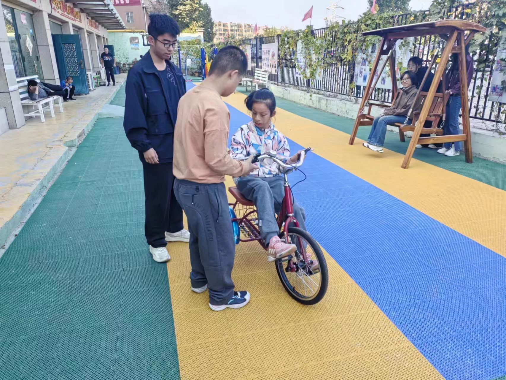 伴着午后的阳光,志愿者们来到信望爱基地,准备开展志愿服务工作。活动伊始,志愿者们协助消防宣传员郭康老师向孩子们讲解了基本的消防知识,增强了孩子们的消防安全意识。讲解过程中,郭老师通过实物道具演示和童心互动等环节,用生动易懂的展示,使得孩子们在愉快的氛围中学到了消防工具的使用、消防隐患的消除以及现代化消防工具的种类等知识。志愿者们还与郭老师一同带领孩子们完成了消防演习,进一步锻炼了他们的消防逃生能力。完成消防知识的学习后,志愿者们在院子里拉着自闭症孩子们的手,和他们一起聊天、荡秋千,耐心地教他们准确发音、认字。孩子们也逐渐敞开心扉,与志愿者们分享日常生活中的事,脸上洋溢着纯真的笑容。