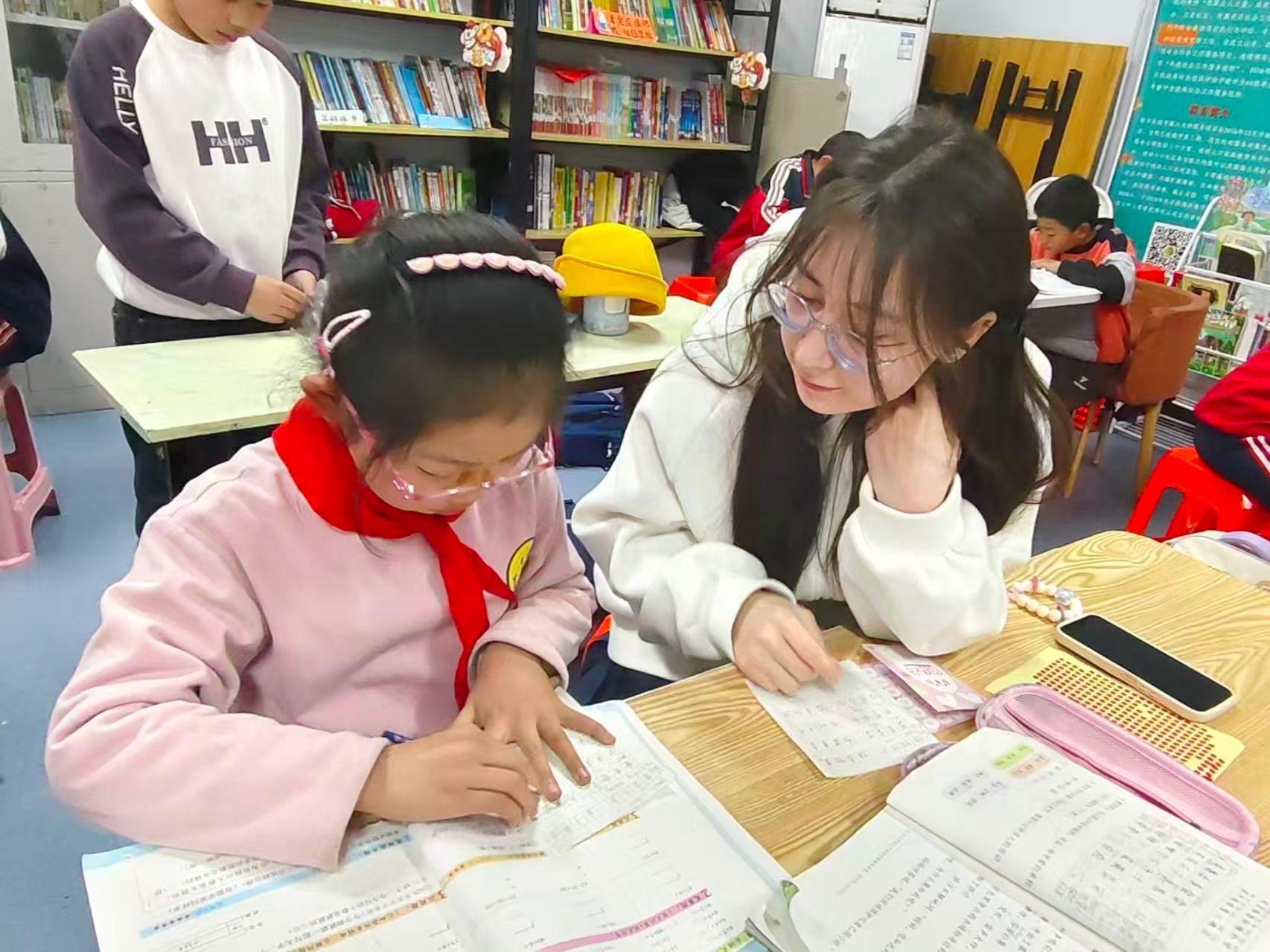 活动现场,志愿者们带着十足的耐心与细心,为孩子们开展一对一课业辅导。面对孩子们课业上的困惑,青年志愿者们耐心驻守,根据每个孩子的知识掌握程度,量身定制专属辅导方案。作业批改环节,志愿者们逐一审视每一道习题,用通俗直白的语言拆解易错难点,手把手演示解题步骤,从审题思路到书写规范逐一细致梳理。在轻松愉快的氛围中,志愿者们不仅陪伴孩子们高效完成了课后作业,手把手教会了他们归纳错题、梳理逻辑的学习方法,更引导他们慢慢地掌握学习方法。从陌生拘谨到熟络默契,志愿者们以真诚与担当拉近彼此距离,活动室里处处展现着青春奉献的身影。