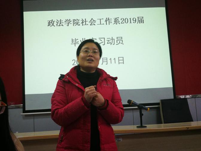 在动员会上,张荣主任代表社会工作系就毕业实习工作向同学们提出要求和殷切希望。她强调指出,毕业实习和毕业论文是专业培养的重要组成部分,务必珍惜这次实习机会,切实提升自己的专业实务能力,为未来的就业或深造打下专业基础,她还要求学生在寒假和实习过程中切实保障人身安全、财产安全,从思想、精神、心态和行为等方面做好准备,尽快完成从学生到员工角色的转换,严格按照实习规定与指导老师保持联系,定期汇报实习情况,能够从专业的角度来看待实习中的问题。负责实习的赵宝爱老师再次强调了实习单位选择、实习纪律,要求及时把周志和实习报告上传到校友邦,同时就毕业论文日程安排、毕业论文的选题、文献的查阅、研究方法的选择、开题报告的撰写、毕业论文的结构等进行了讲解。最后,各指导老师与其指导的学生进行了沟通和交流。
